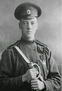 Н.С. Гумилев. Практически с первых дней войны поэт служил в первом эскадроне лейб-гвардии Ее Величества императрицы Александры Федоровны и вскоре отправился на передовую, на границе с Восточной Пруссией. Уже через три месяца он был награжден Георгиевским крестом 4-й степени, затем — 3-й степени, а в марте 1916 г. получил первый офицерский чин прапорщика с переводом в 5-й Александрийский гусарский полк. В апреле 1917 г. из штаба полка пришло сообщение о награждении прапорщика Гумилева орденом Святого Станислава 3-й степени, но поэт не успел его получить, поскольку Россия была выведена из войны Брестским миром. В апреле 1918 г. поэт вернулся домой.